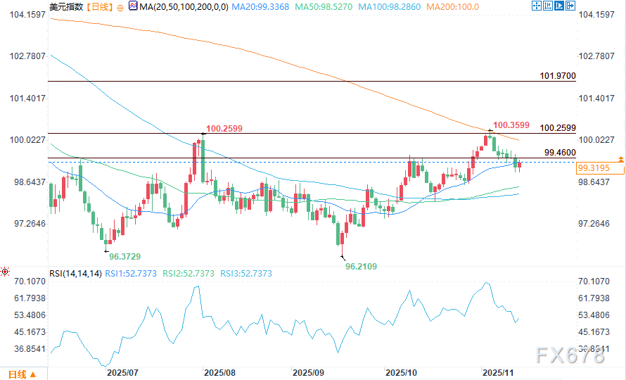 汇通财经APP讯——周五(11月14日)美盘时段,美元指数在守住周四98.991的盘中低点后,小幅回升至99.30附近企稳,但整体仍承压,本周累计跌幅有望达到0.3%。此前美国政府停摆结束,大量延迟的经济数据即将集中发布,交易员正为此做准备。