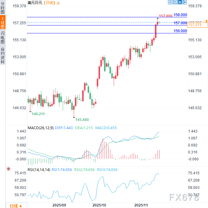 下行方面,当前任何技术性回调可能在157.00关口下方寻得有效支撑,若跌破则关注156.65-156.60区域。失守该支撑区间后,美元/日元可能下探156.00心理关口——该位置将成为关键枢轴点,一旦有效跌破,或将打开更深度的下行空间。