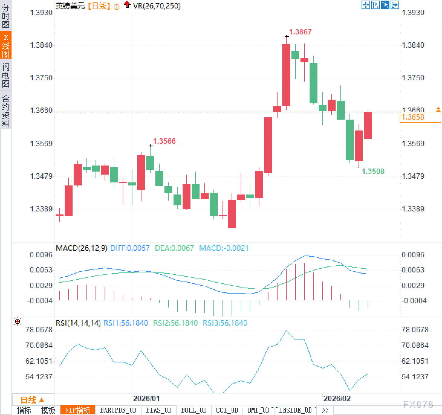 从价格结构来看,英镑兑美元正处于一个关键的观察窗口。此前一轮上涨最高触及1.3867,随后快速回落至1.3508一线,显示出上方抛压较重,且短线获利盘集中离场。当前汇价回到1.3650附近,恰好处于前期回调区间的中轴位置,多空双方在此处展开拉锯,方向尚未明朗。